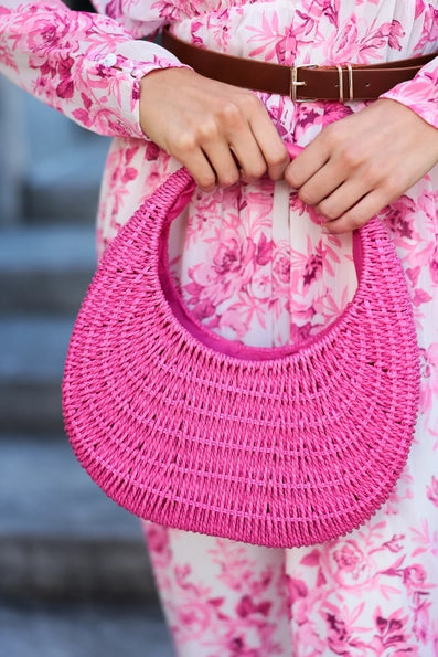 Paper Straw and Pu; Single Handle. The Menorca Bag Is The Ultimate Showstopper For Your Sunny Escapades! Its Chic Half-Moon Silhouette, Woven Texture, and Bold Circular Handle Make It Both Stylish and Easy To Carry. This Bag Is Perfect For Brunches, Beach Days, Or Summer Soirees. Its Compact Yet Roomy Design Fits All Your Essentials While Effortlessly Complementing Your Outfit.