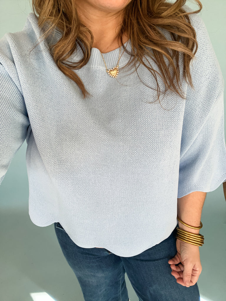 Solid knit 3/4 dolman sleeve top featuring scallop hem. Unlined. Knit. Non-sheer. Medium weight.