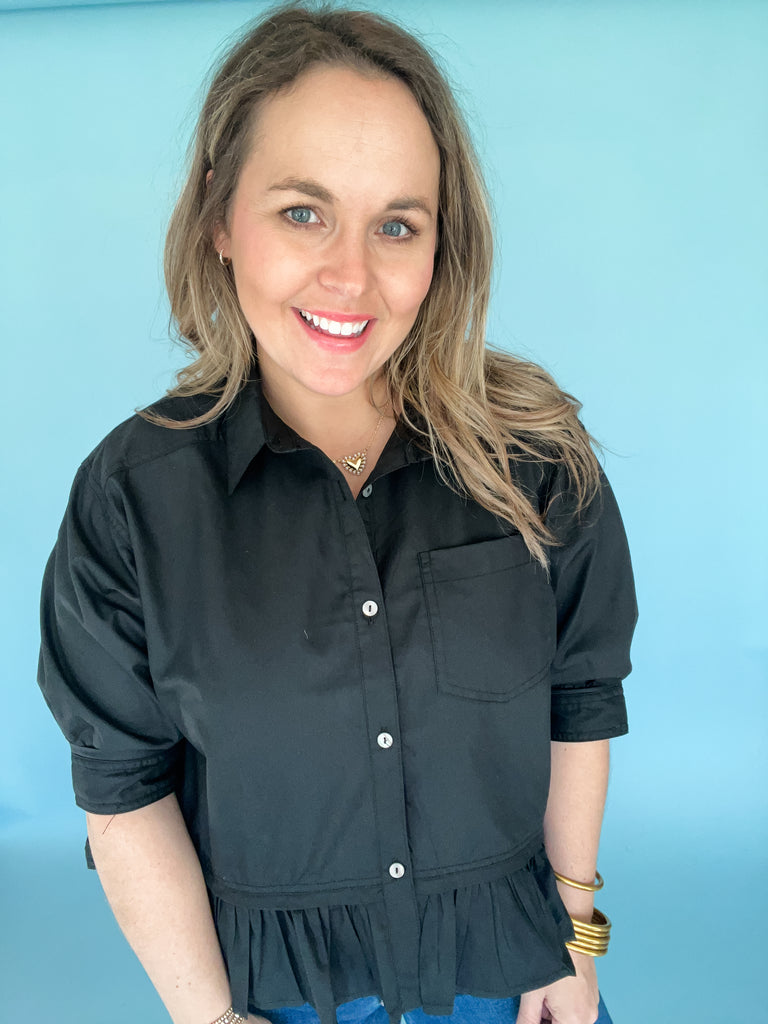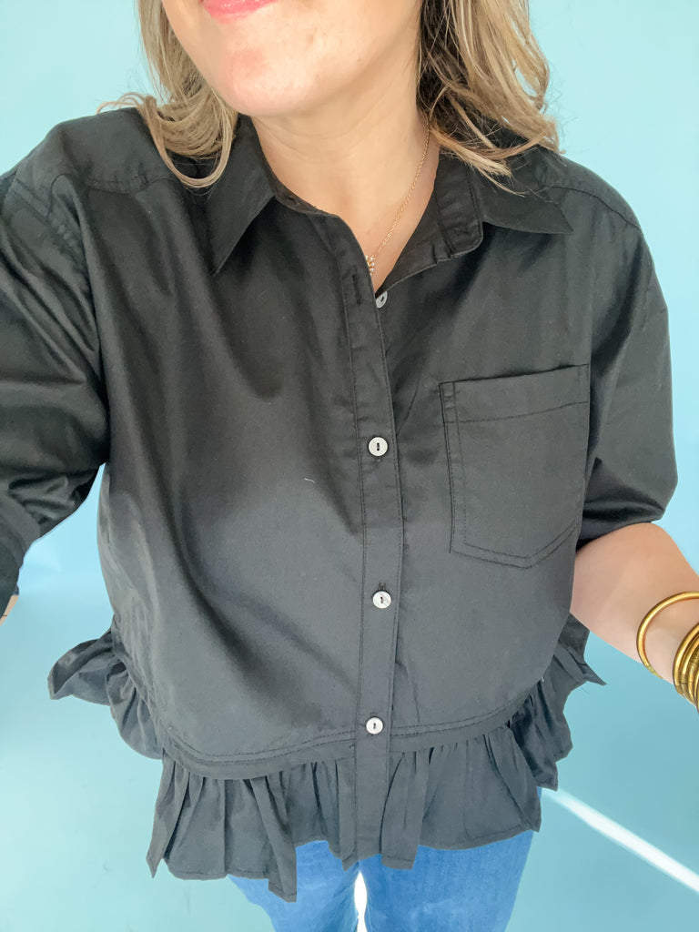 Miranda Ruffle Hem Button Up- Black-K. Ellis Boutique