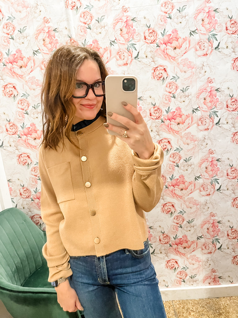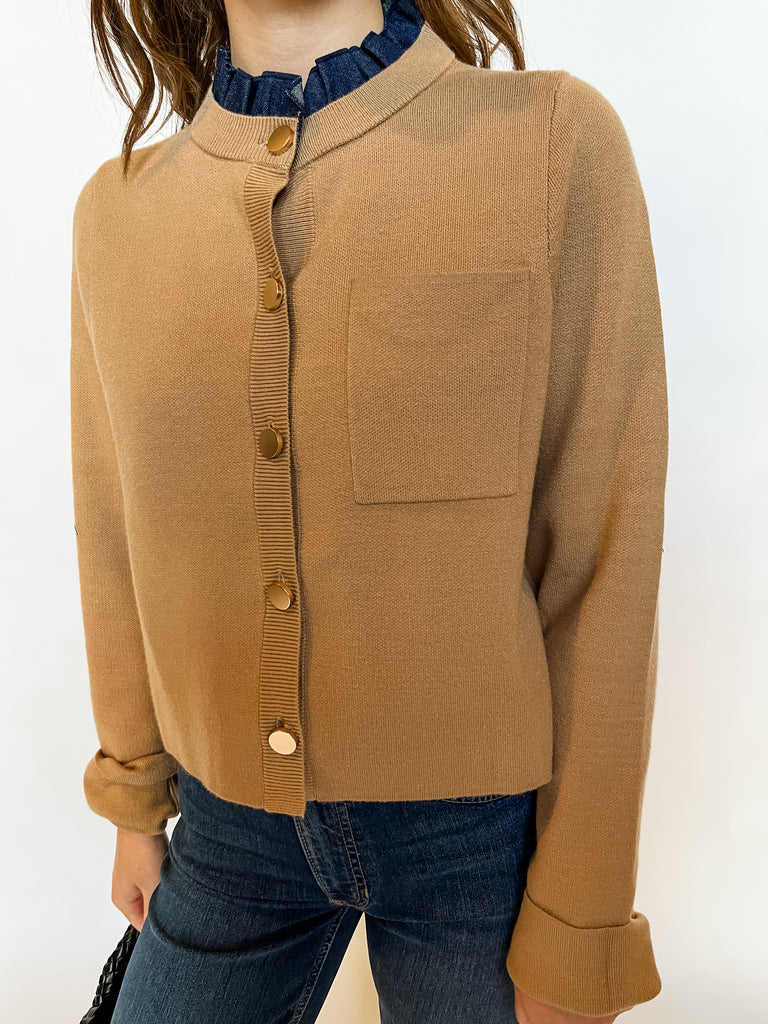 Super Chic Cardigan with denim ruffle trim on neckline. Gold buttons down the front with patch pocket on left side.