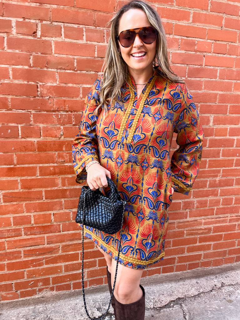 Long sleeves boho print shift dress with side pockets, collared neckline, cotton breaded trim detail.