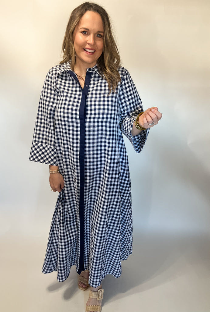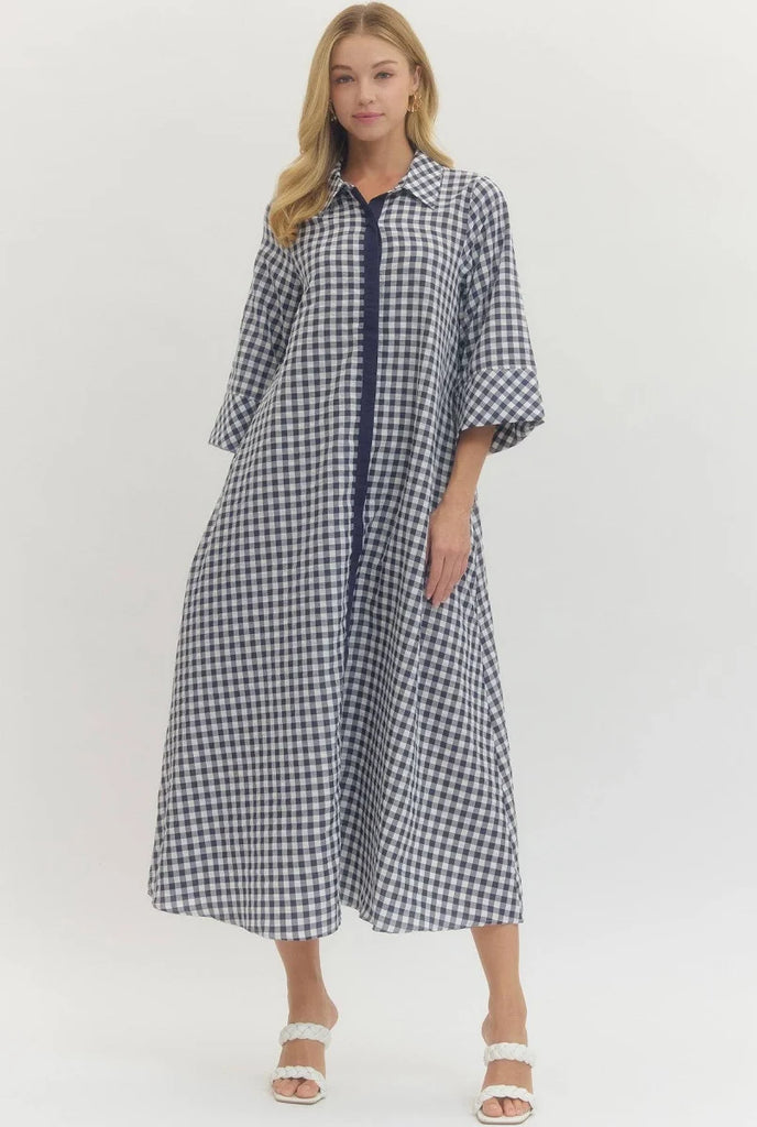 Gingham Print Collared Midi Dress- Navy