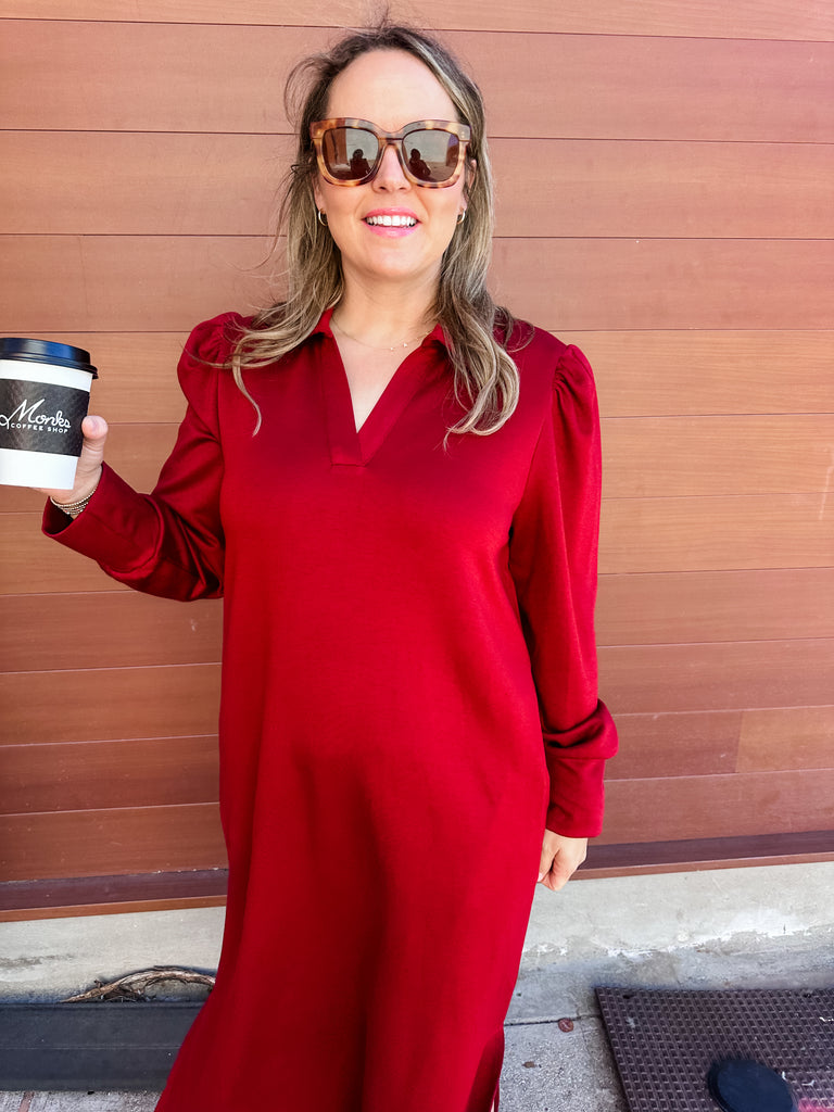 Long sleeves solid midi dress with side slit, collared neckline, puffy shoulder