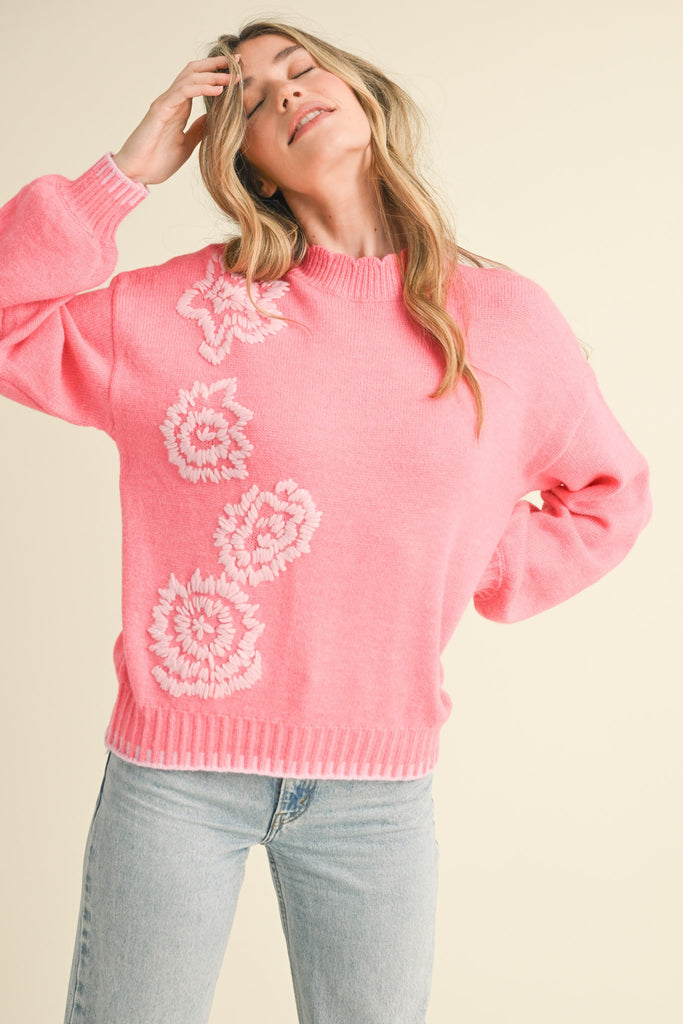 Madeline Floral Embroidery Mock Neck Sweater- Pink