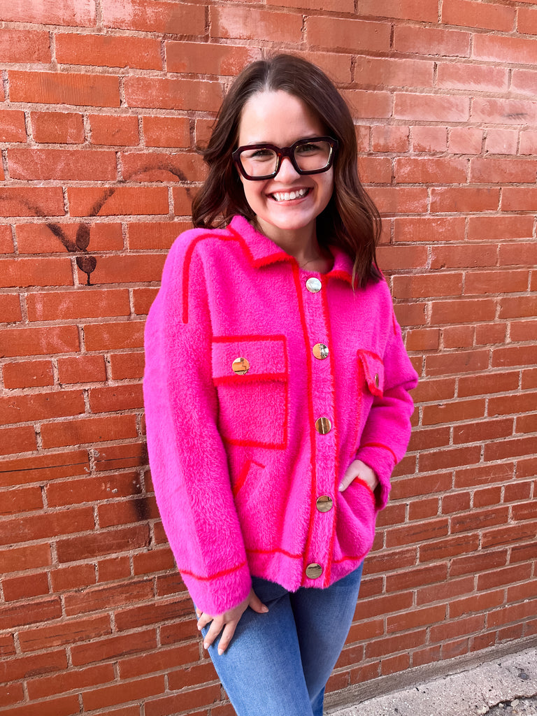 a chic finish. - Contrast - Pockets - Button up - Collared - Color: Fuchsia Red Size + Fit - Model is 5'9" and wearing size XS - Measurements taken from size S - Chest: 22 3/4" - Length: 22 3/4"