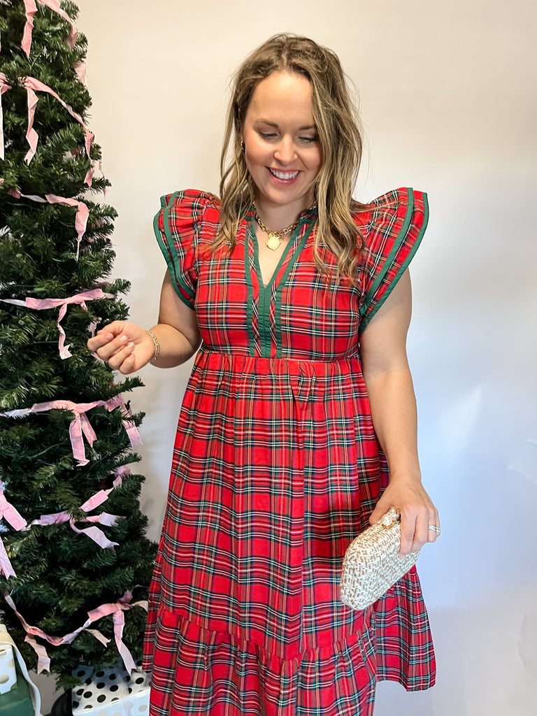 Plaid Flutter Sleeve Midi- Red