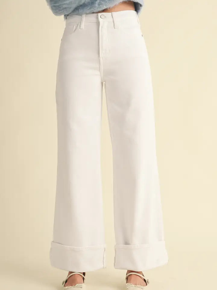 Make a statement in these Just Black Denim White Palazzo Pants - the ultimate blend of polished and on-trend. Designed with a flattering high rise and wide leg, these jeans elongate the legs while offering a relaxed, effortless feel. The structured cuffed hem adds a modern touch that sets them apart from your everyday white denim.