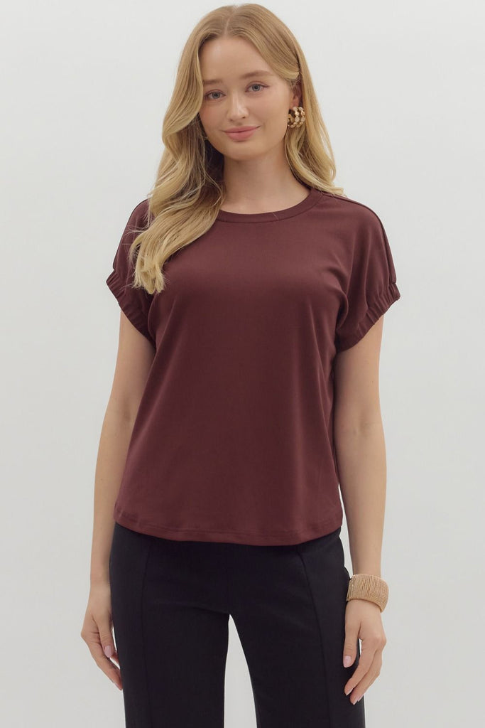 Solid pullover jersey knit top featuring elasticated sleeve openings. Unlined. Knit. Non-sheer. Lightweight