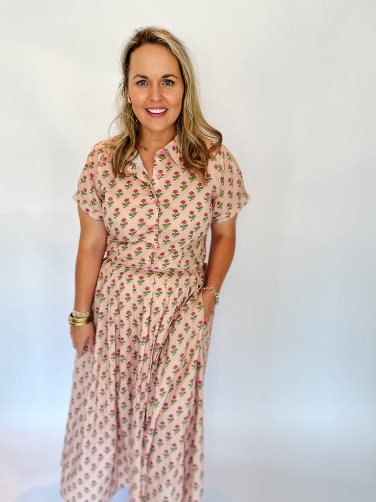 Mini floral pattern short sleeve fitted shirt. Unlined. Pleated midi skirt. Elasticated waistband at back and side zipper closure. Pockets at sides. Lined. Woven. Non-sheer. Lightweight.