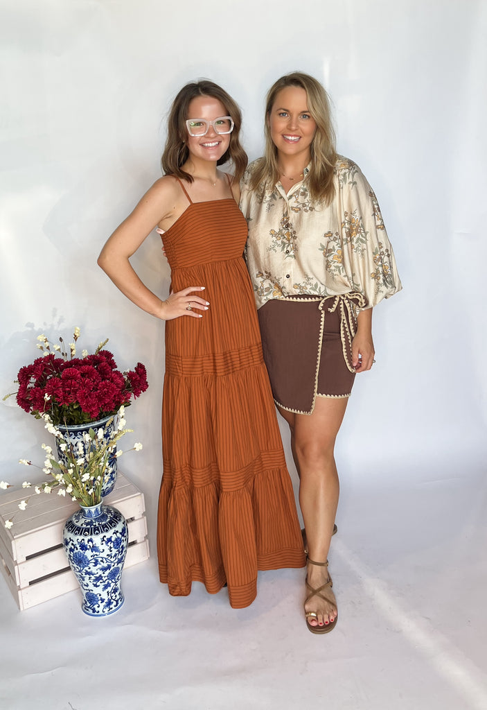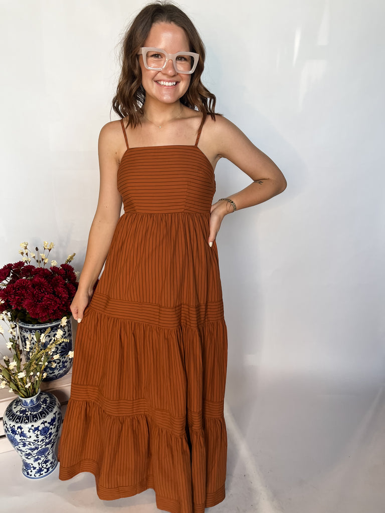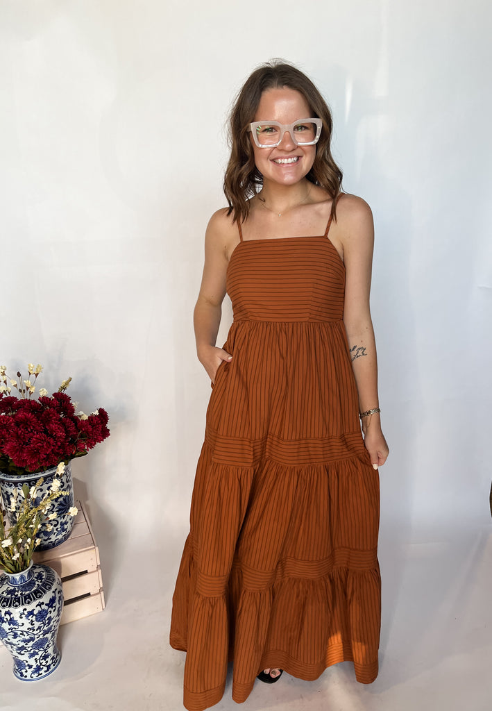 Radiate understated elegance in the Terracotta Ridge Maxi Dress, a timeless piece designed for relaxed yet refined moments. Crafted from lightweight woven fabric with subtle tonal stripes, this maxi features delicate spaghetti straps and a square neckline for a touch of modern simplicity. The tiered skirt flows gracefully, offering effortless movement and comfort, perfect for sunlit strolls or alfresco gatherings. Its earthy terracotta hue brings a warm, grounded charm, making it a versatile choice for both casual days and special occasions. Style it with woven sandals for a laid-back look or elevate with wedges and statement earrings for a chic evening ensemble