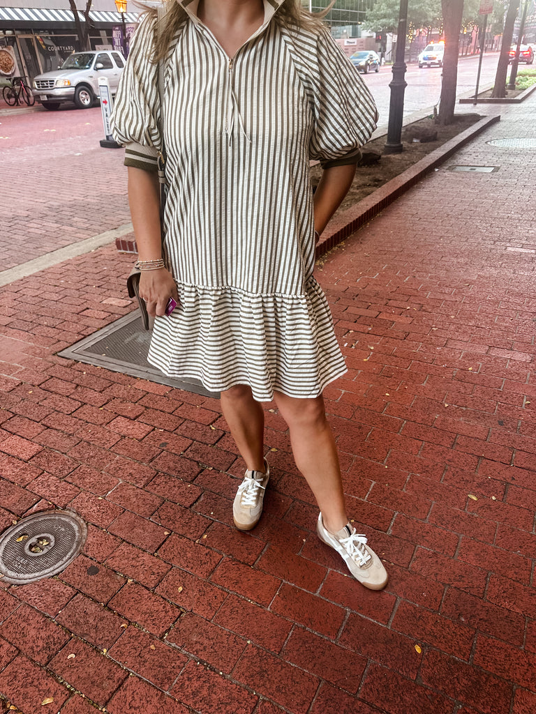 Striped pattern ruffle hem zip front mini dress featuring multicolor accent band trimmed raglan bubble sleeves and neck. Side pockets. Lined. Woven. Non-sheer. Lightweight.