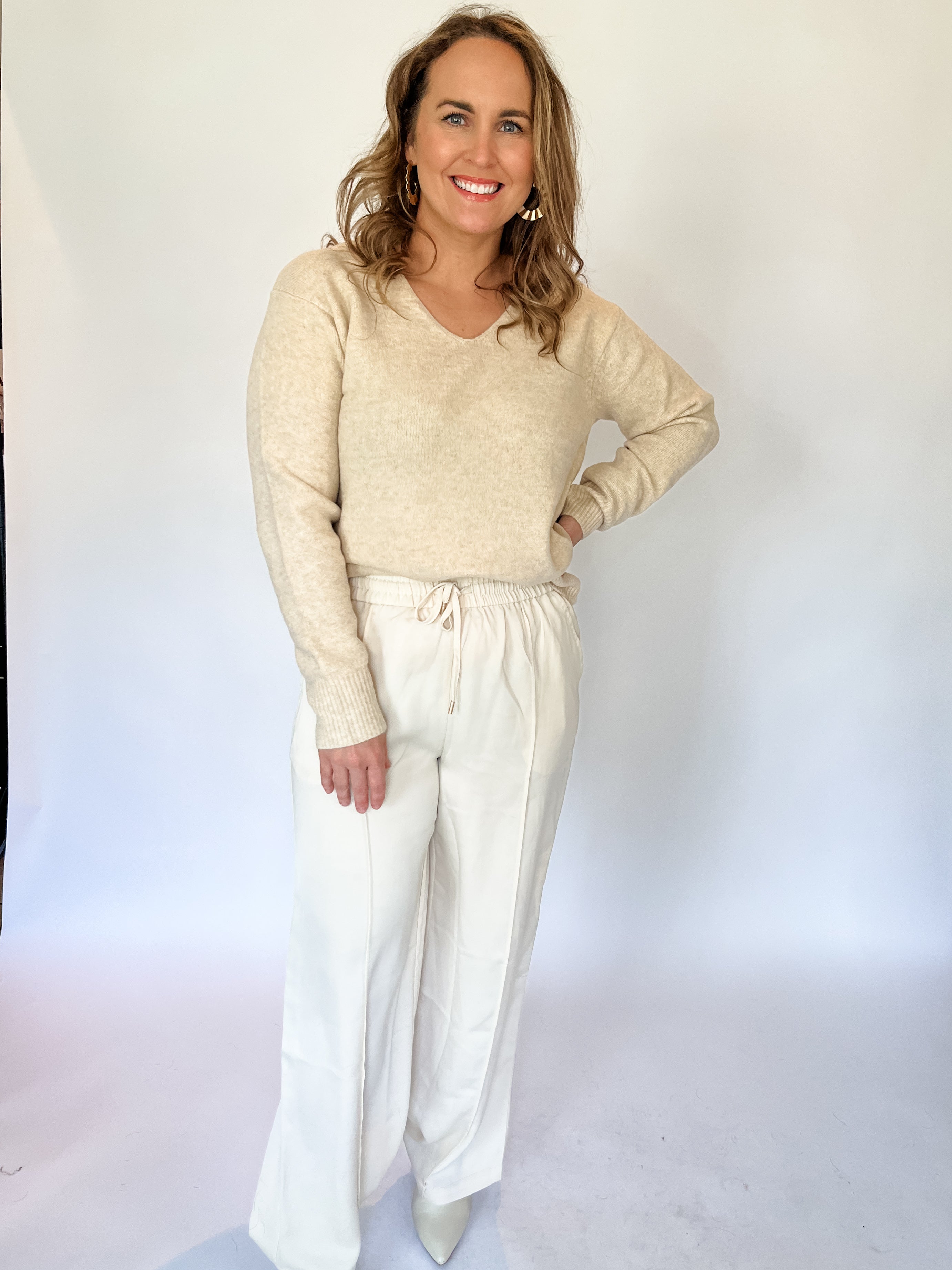 Satin oatmeal color with drawstring and pin stripe down the front.