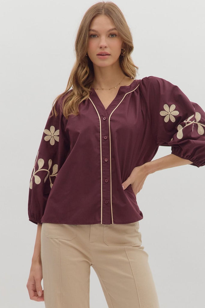 Solid top featuring embroidered ¾ sleeves. V-neck button front closure at front. Unlined. Woven. Non-sheer. Lightweight.