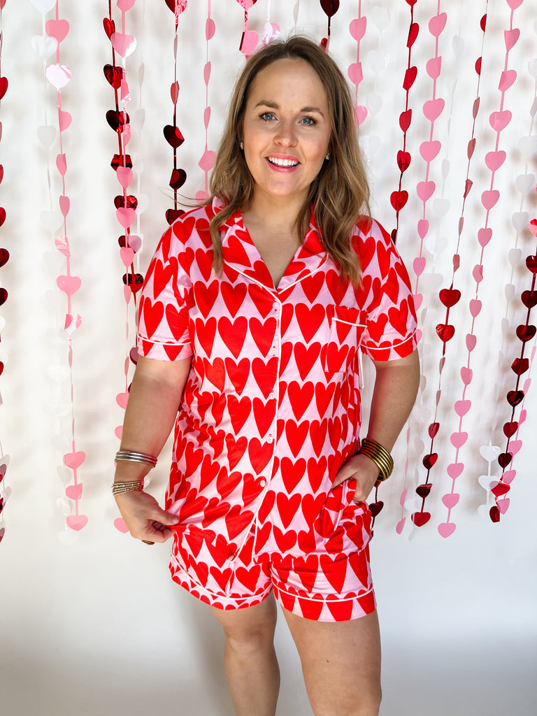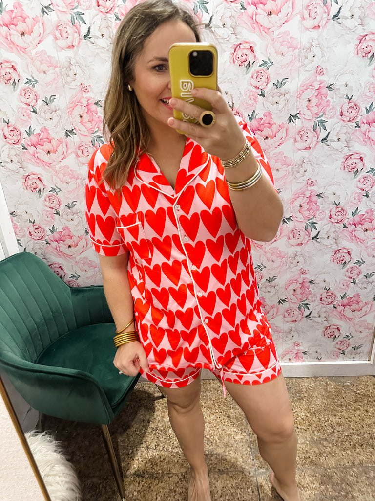 Step into the ultimate comfort with our Pink and Red Hearts Comfy Loungewear Set! This delightful two-piece pajama ensemble is designed to elevate your lounging experience with its cozy design and charming aesthetic. Crafted from soft, breathable fabric, this lounge set features a lovely pink hue adorned with adorable red hearts all over. The set includes a short sleeve top and coordinating shorts, offering a relaxed fit that ensures maximum comfort and freedom of movement. Perfect for lounging at home or enjoying a cozy night in, our Pink and Red Hearts Comfy Loungewear Set is the perfect addition to your loungewear collection. Treat yourself to luxurious comfort and style with this adorable set! two piece matching set