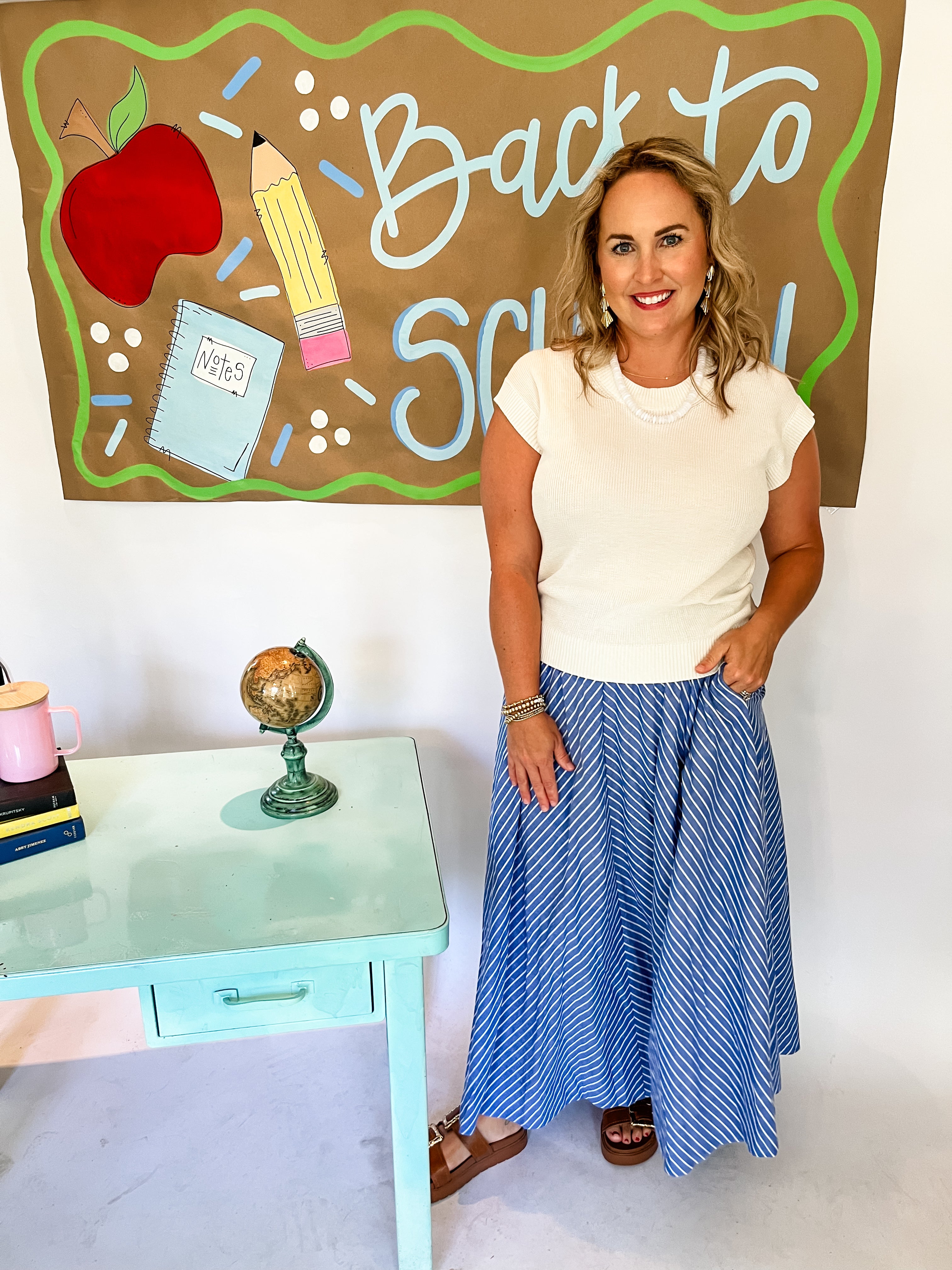 Stripe pattern pull-on midi skirt. Elasticated waistband. Pockets at sides. Lined. Woven. Non-sheer. Lightweight