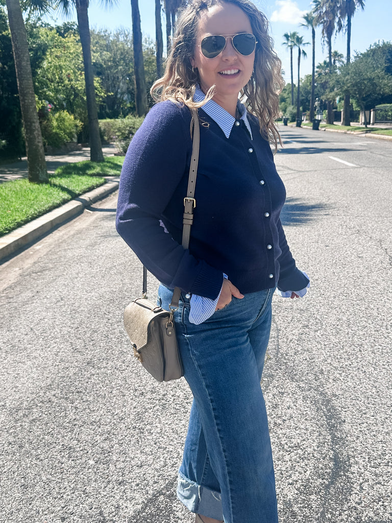 Gorgeous navy cardigan with white and blue striped collar and cuffs. Features beautiful pearl buttons.