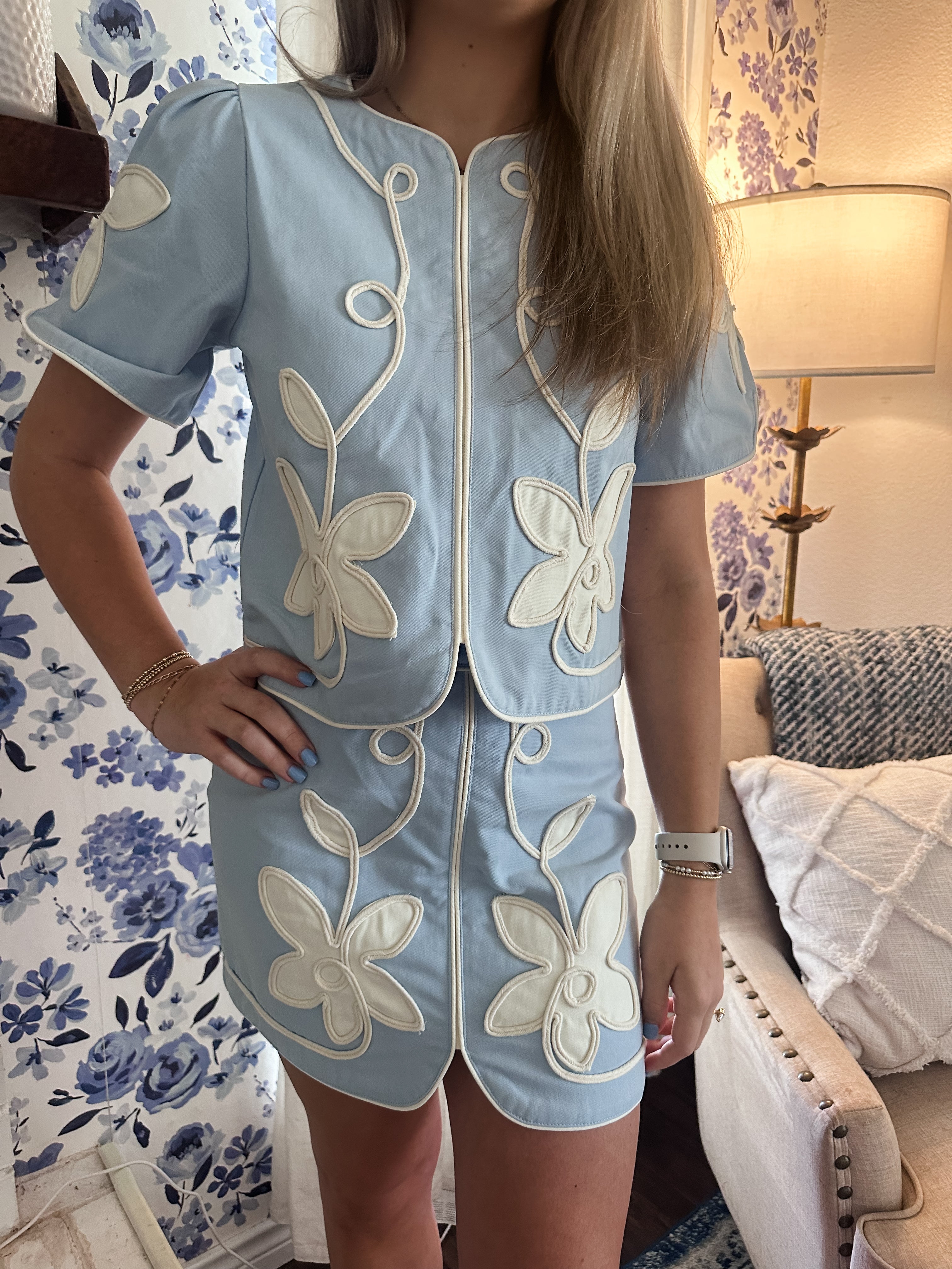A structured short sleeve top featuring contrast floral appliqué detailing throughout. Designed with a rounded neckline, decorative piping trim, and puff sleeves. Finished with a concealed back zipper closure.