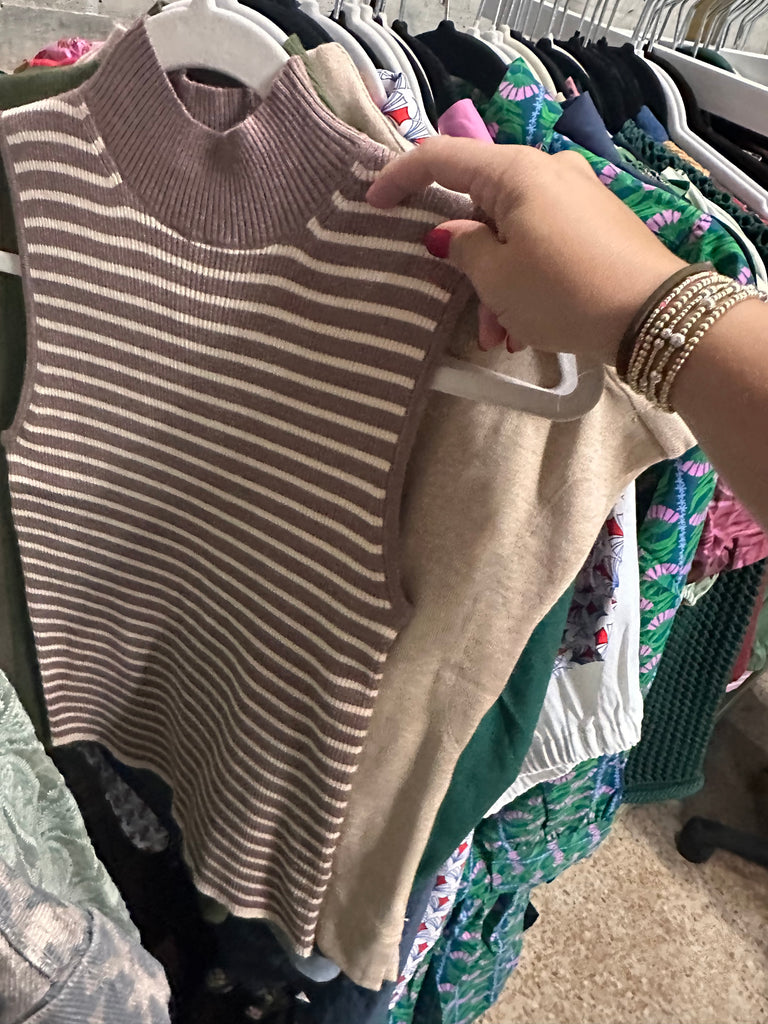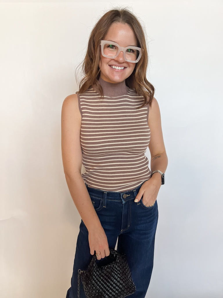Mock Neck Sleeveless Sweater Top- Mocha & Cream Stripes