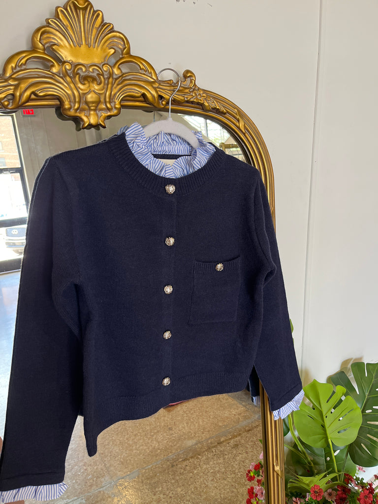 Crewneck Button Up Cardigan with front pockets and striped ruffle neckline. Silver detail buttons. Slightly Cropped fit.