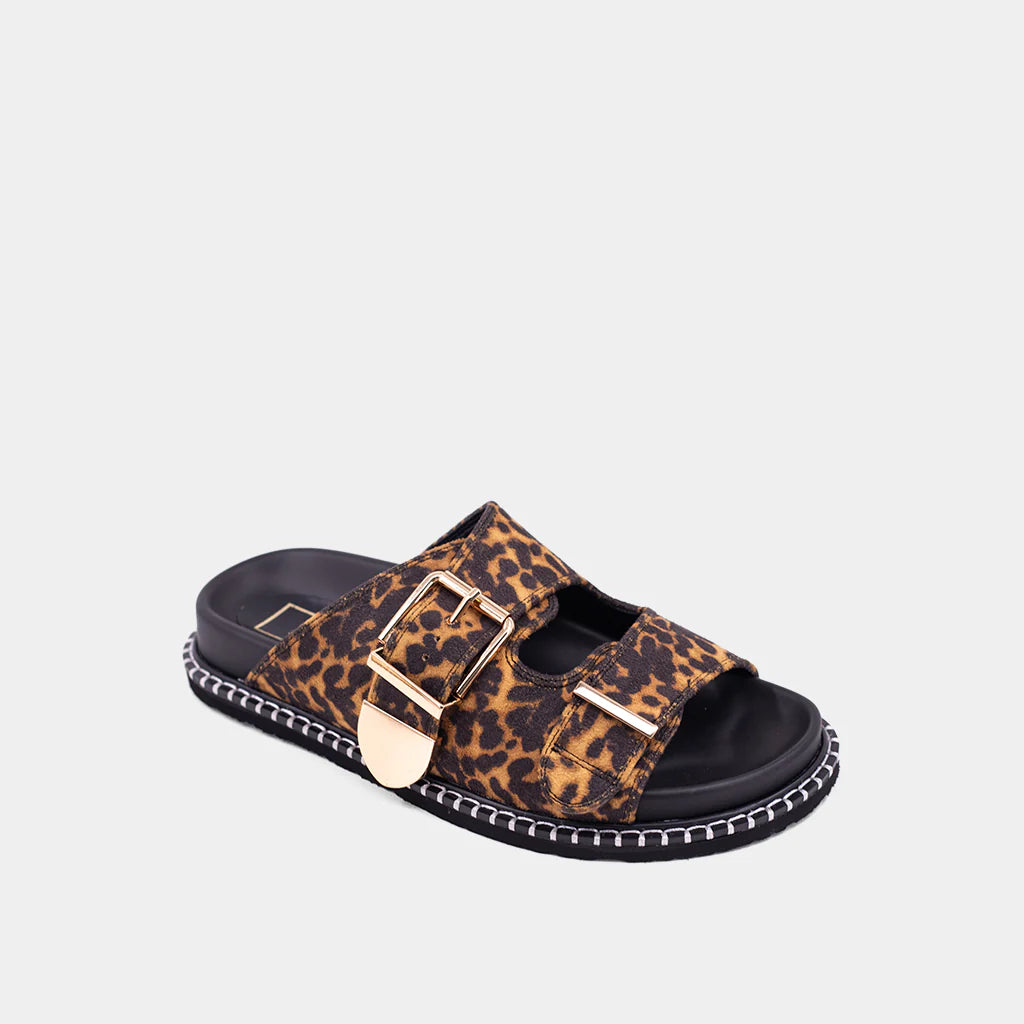 Make a bold statement with the CHARLOTTE sandal in luxurious leopard-print suede and faux leather. Designed with dual wide straps, gold-tone buckles, and a crest accent, this sandal blends fierce elegance with modern edge. The contrast-stitched sole and cushioned footbed offer all-day comfort, making it the perfect mix of wild and chic.