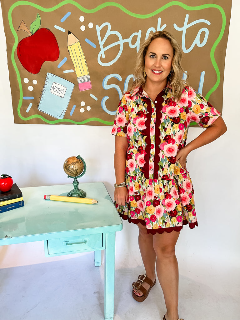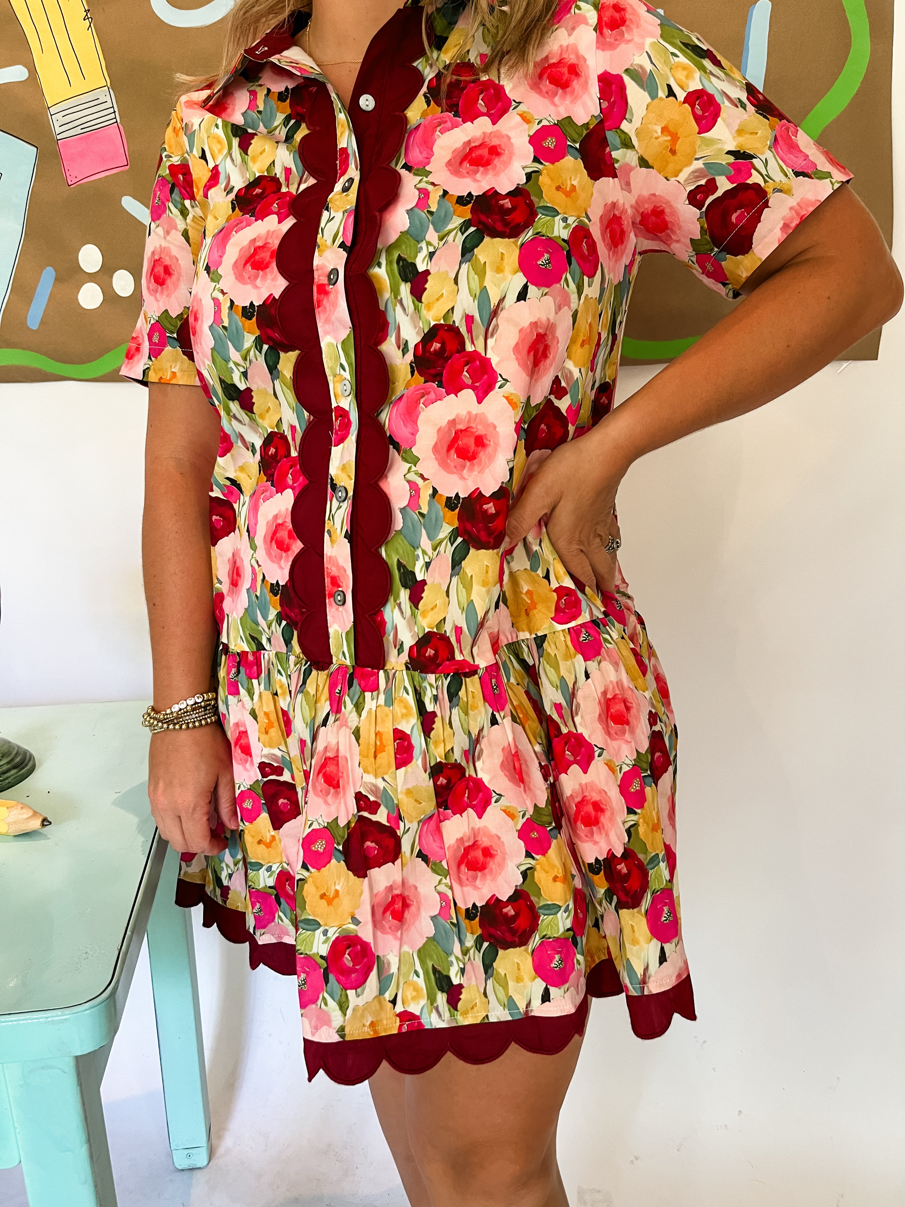 Floral print short shirt sleeve collar button front closure ruffle hem mini dress featuring contrast scallop embroidered detail. Side pockets. Lined. Woven. Non-sheer. Lightweight