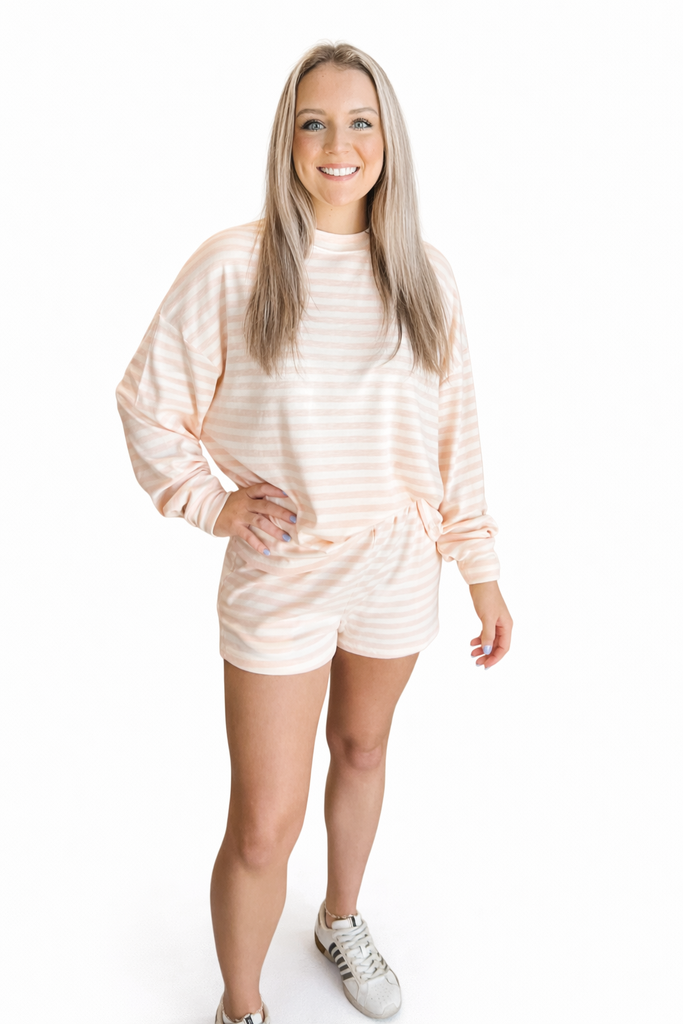 A striped knit short featuring a comfortable elastic waistband on the shorts and a relaxed silhouette top. Designed with comfort and style in mind.