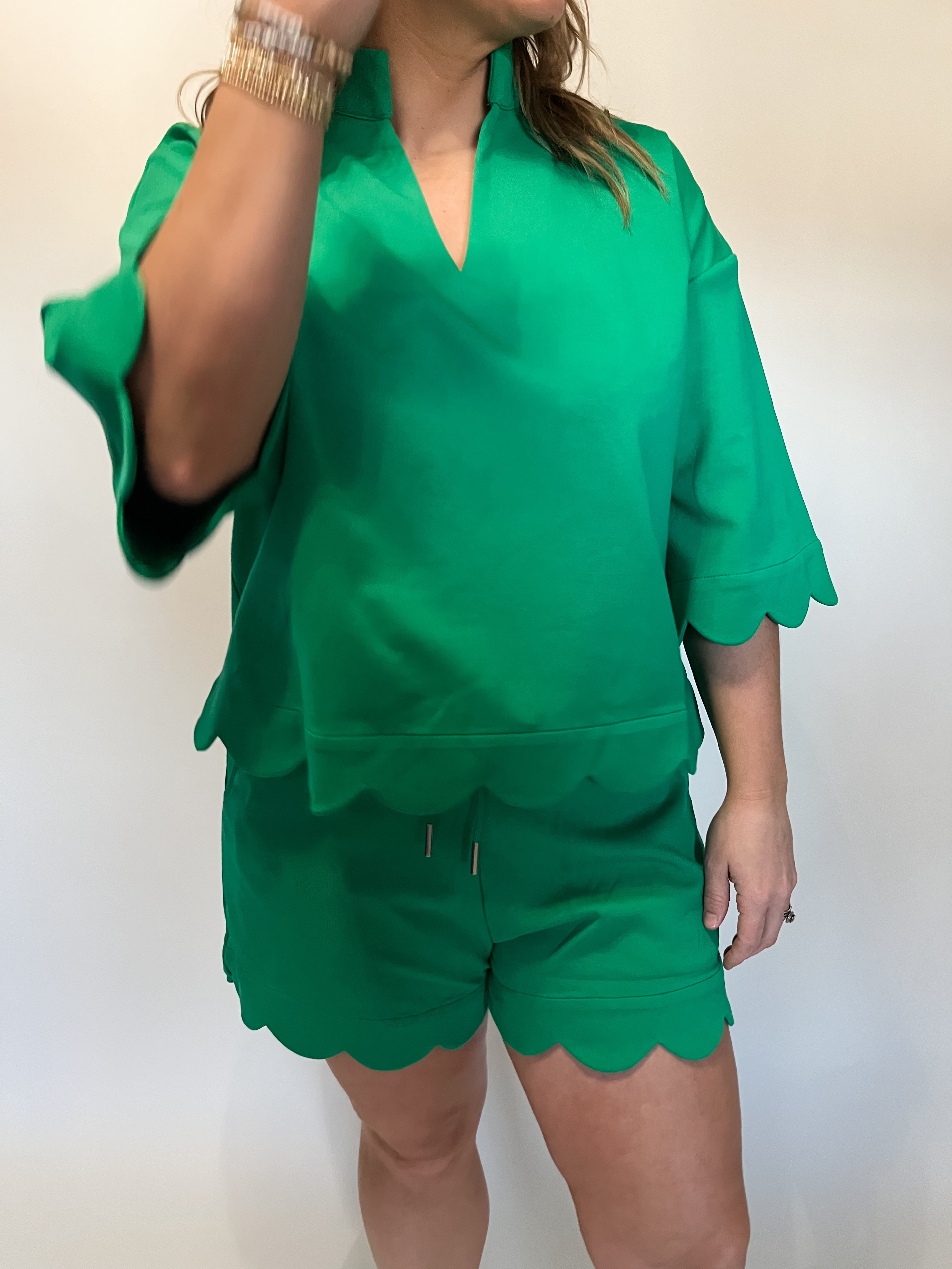 Solid scallop hem shorts featuring elastic waistband with drawstring. Side pockets. Unlined. Knit. Non-sheer. Lightweight.