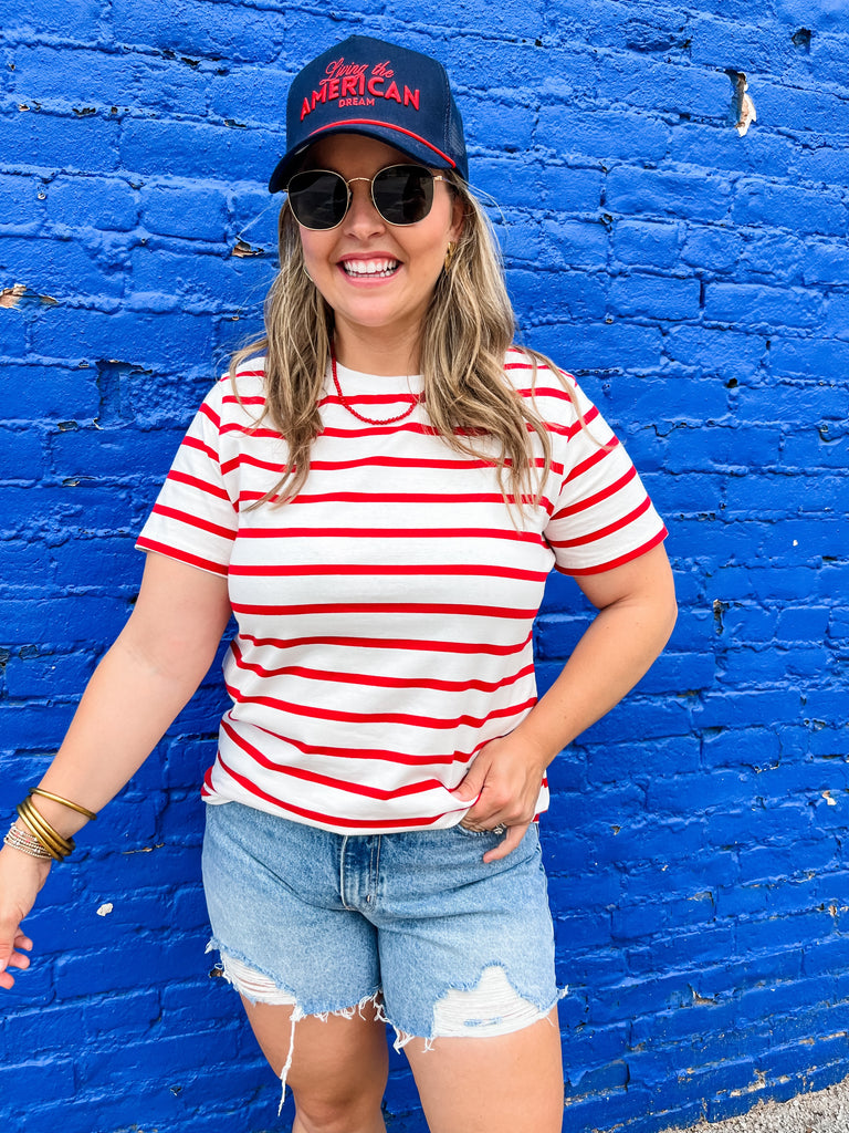 Crew neckline - Cotton women's knit top - Short sleeve - Allover striped - Basic fit T-shirt - Pullover style - Core - Lightweight and breathable for spring summer and fall casual