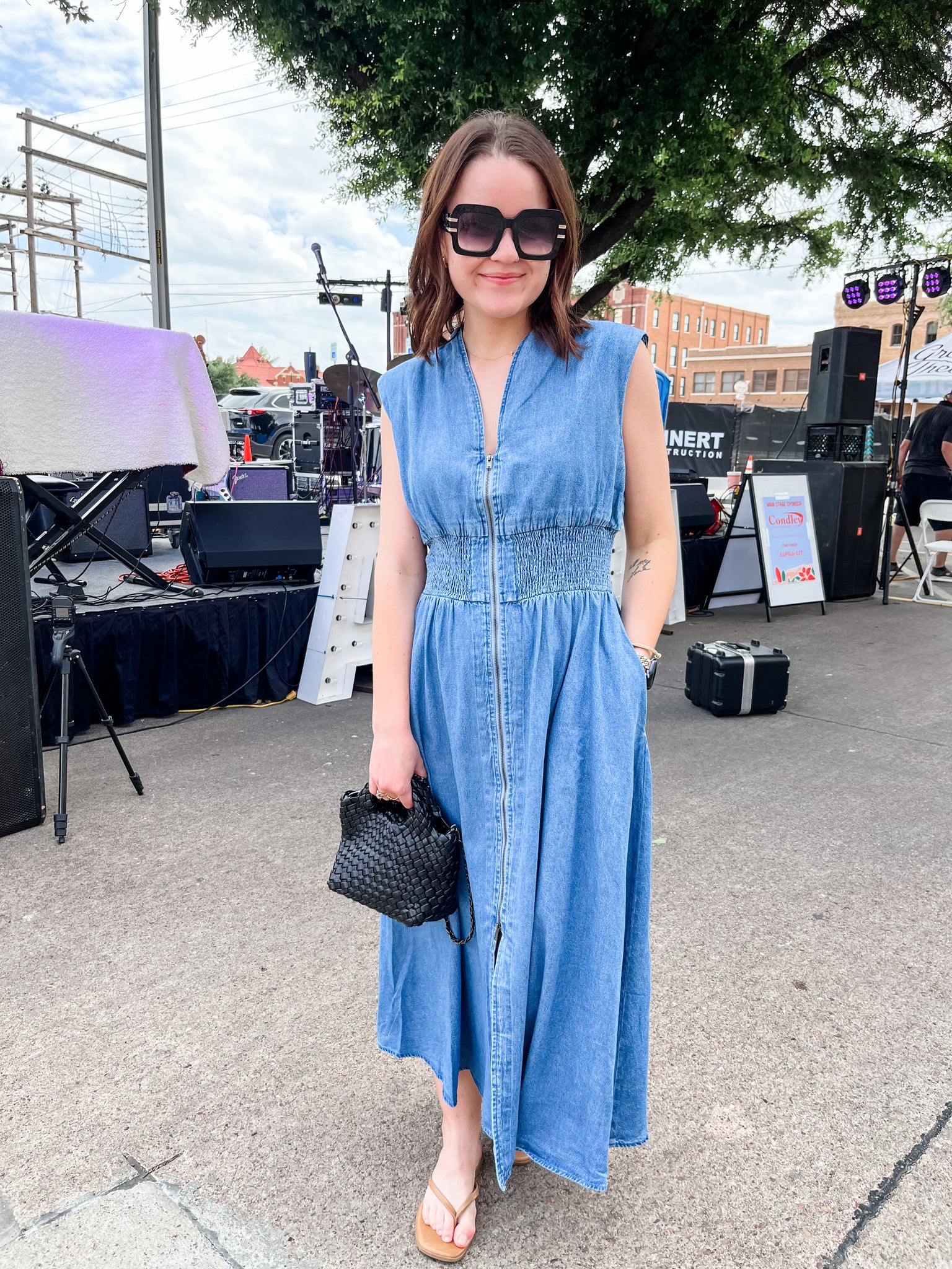 V-neck sleeveless midi dress featuring zipper closure at front. Smocking at waist. Pocket at sides. Lined. Woven. Non-sheer. Lightweight.