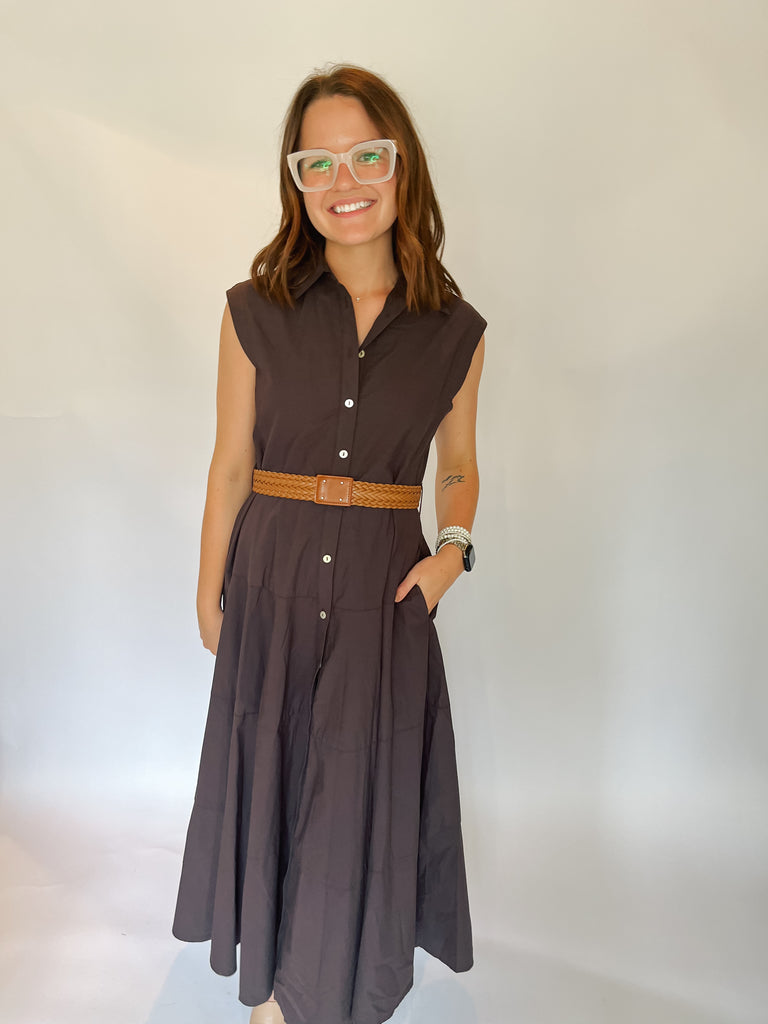 Solid Sleeveless Belted Mid Dress- Dark Brown