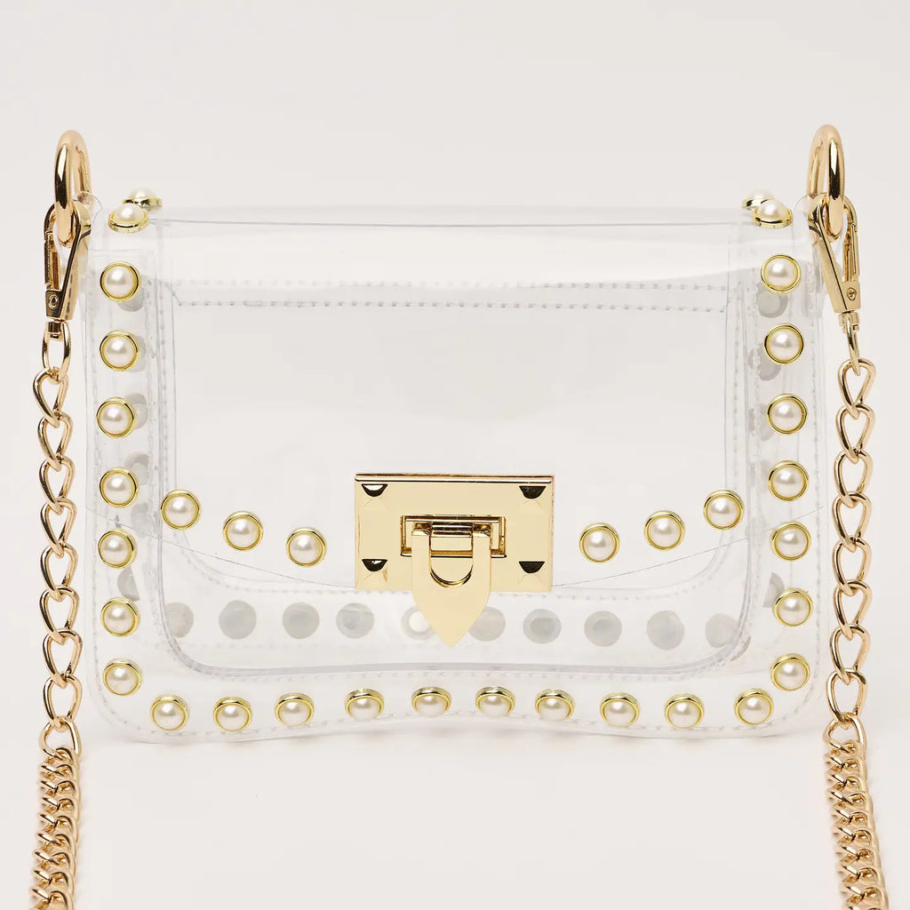 Score with the biggest winner in our clear handbag playbook - The Jackie! The Jackie changed the handbag game by proving clear handbags could be both functional and chic. This style includes pearl metal studs and a gold chain. The Jackie is NCAA and NFL-compliant and the ideal size to hold your wallet, phone, keys, lip gloss and a few other small items. DETAILS: • W 8" x H 6" x D 3" • Durable PVC • Pearl Stud Accent • Gold-Plated Hardware and Chain