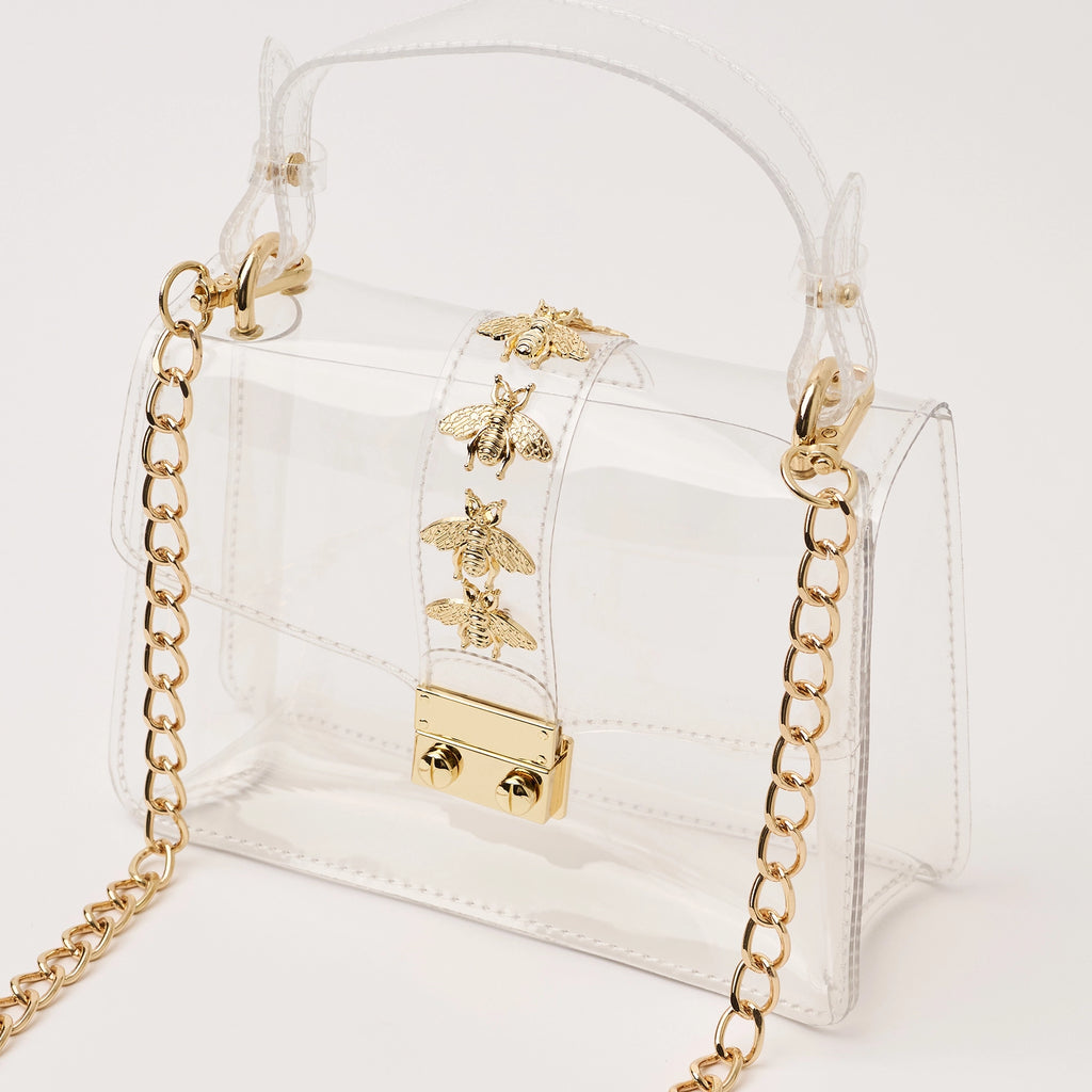 Come see what all the BUZZ is about with Clearly's Kathryn in Bee! This style includes gold bee accent studs and a gold chain. The Kathryn is NCAA and NFL-compliant and the ideal size to hold your wallet, phone, keys, lip gloss, and a few other small items. DETAILS: • W 7.75" x H 6" x D 3" •