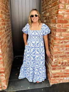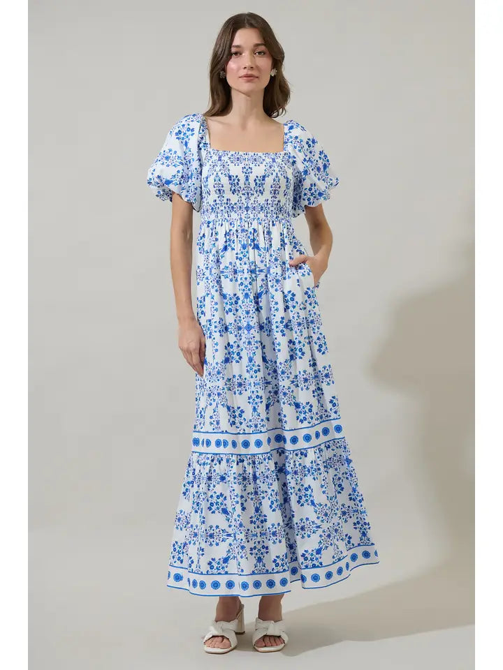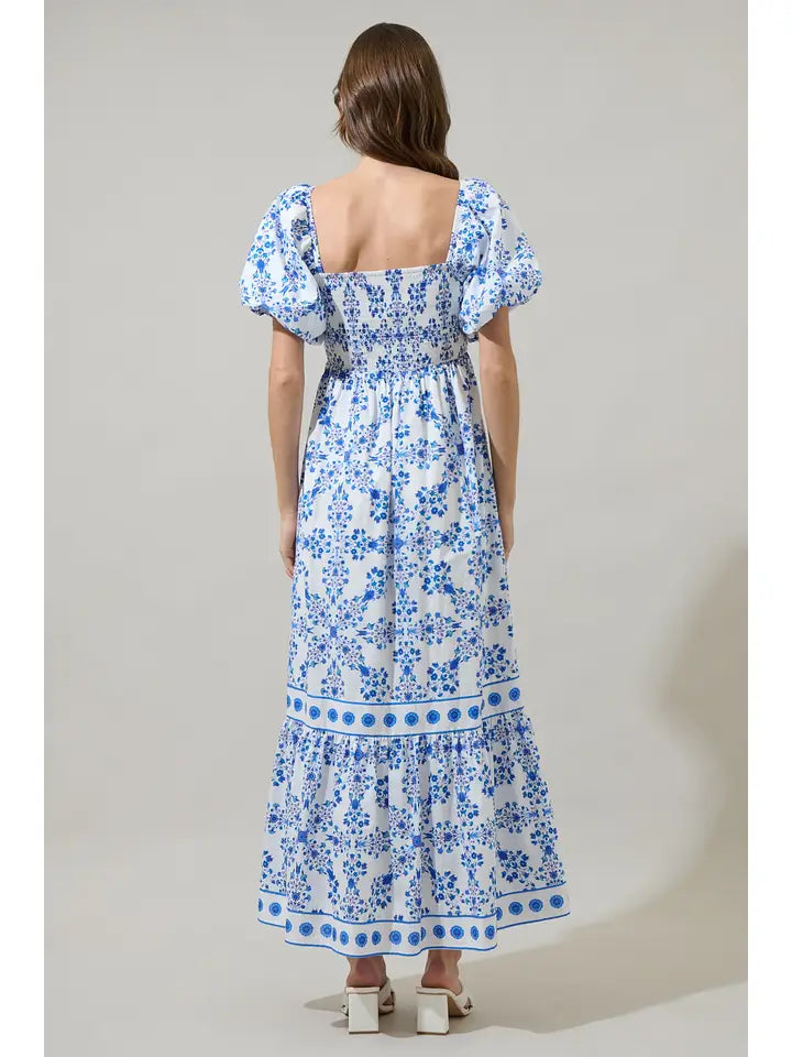 Veral Floral Berky Smocked Maxi Dress- White/Blue